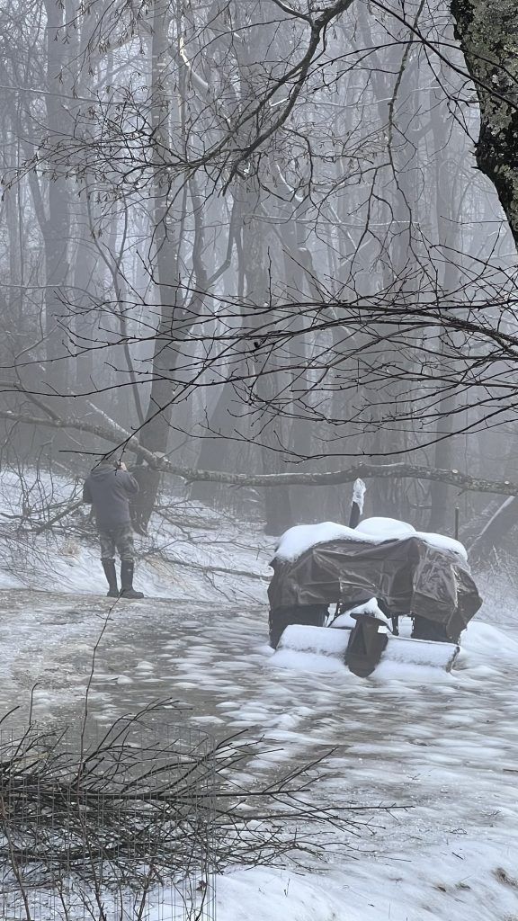 The freezing rain began falling on Tuesday, February 11, on top of a relatively thin layer of snow. We were braced for losing power, and we heard that the governor had already declared a state of emergency and that there were crews in Floyd standing by to clear power lines and fallen trees.