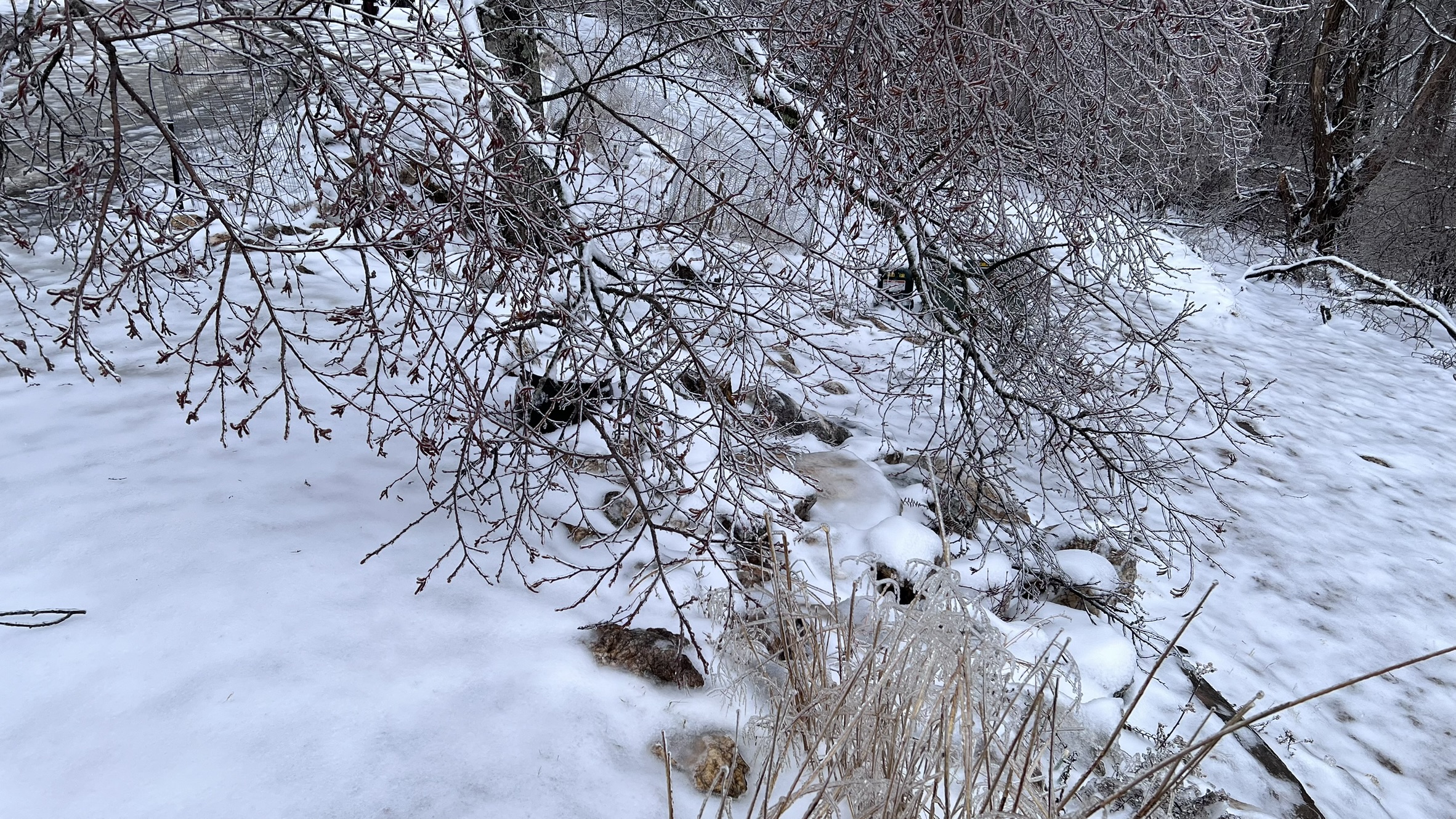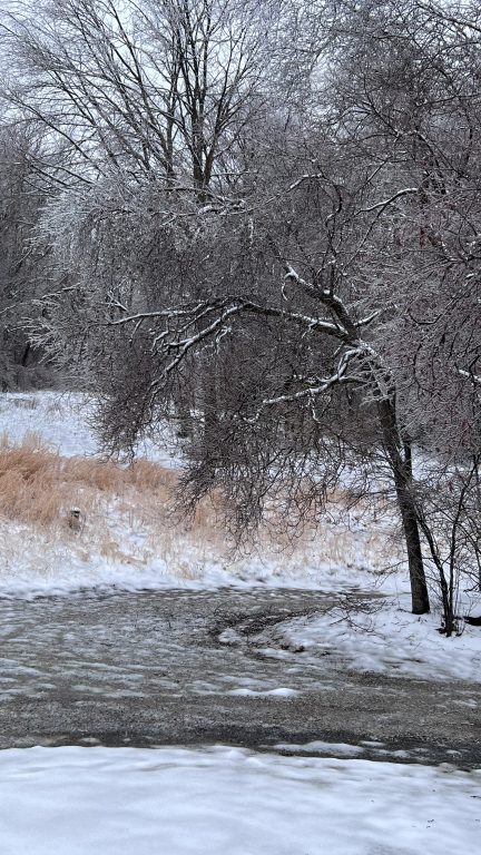 A good amount of the brush in the driveway has been cleared away as of the Saturday a week after we regained power. But around the edges of our woods, things remain broken and hung. It will take a pole chainsaw to trim it up, which we don’t own. So, for now, we get to look at all the broken trees, evidence of quite a destructive ice storm.