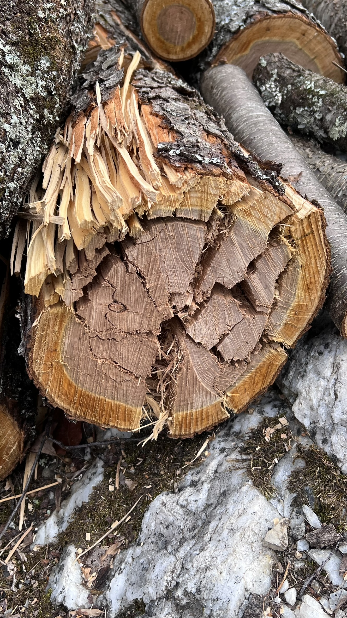 Michael was called away endlessly to help this person and that with either their generator or feeding their animals. So, cleanup has been slow. He had pushed the wild cherry to the side, but it wasn’t until the next week that it got properly cut down below the terribly rending split in its trunk, and the trunk chopped into firewood lengths. I expect it to regrow as a bush. It is said that the North American cherries (Prunus sp.) can be kept to a shrub size for ease of harvest by simple topping!